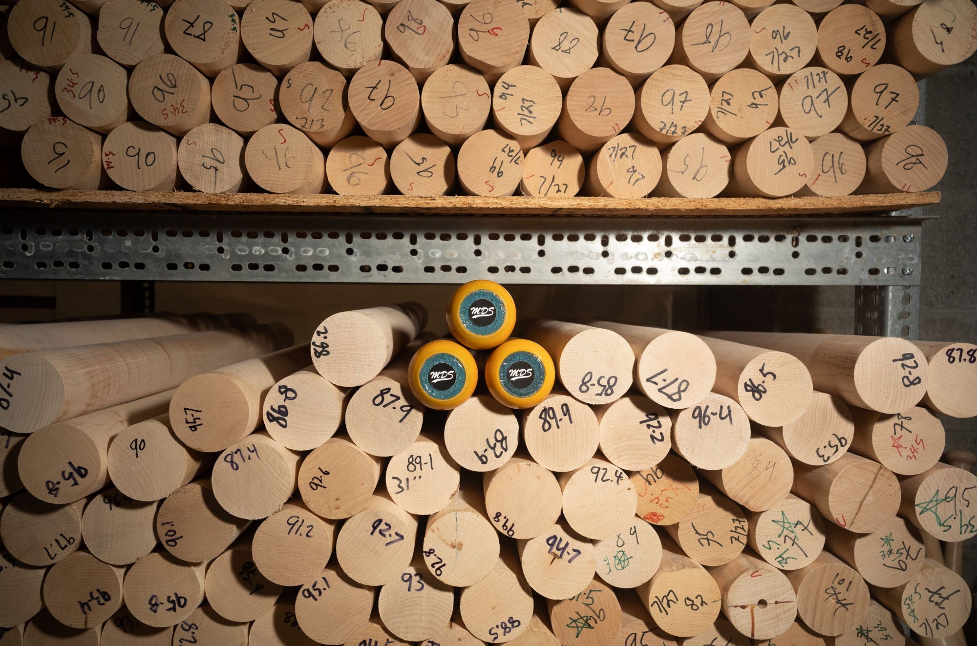 Each billet is hand made, selected and weighed for the proper profile prior to being ready for cutting. The baseball bat is individually turned on a hydraulic lathe and hand sanded before removing for finishing. Every baseball bat and fungo goes through quality control to check for any defects. The wood bat is spray painted (not dipped) with premium finishes and hand sanded between each coat. After the baseball bat is finished drying, logos and striping are applied by hand. Personalized or team engraving can then be added at your request.